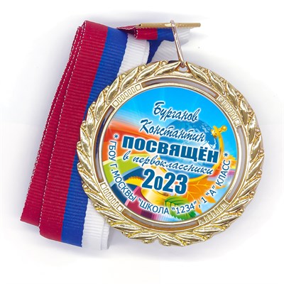 Медаль Premium для праздника "Посвящение в первоклассника", Лента для медали на выбор: триколор, золотистая, синяя и розовая. Нанесение эмалью по металлу. Макет Гравировка по зеркальному золоту. Конструкция: металлическая объемная основа 70 мм, центр металл вставка, нанесение эмалью по металлу или гравировка. Крепление ленты "золотой" карабин. Яркая и эффектная полноцветная печать. Конструкция по параметрам рекомендована для детей от 6 до 12 лет. Макет Антикризис Первоклассник.